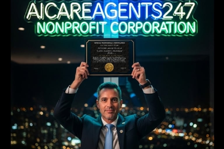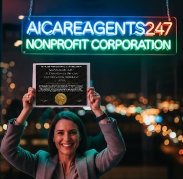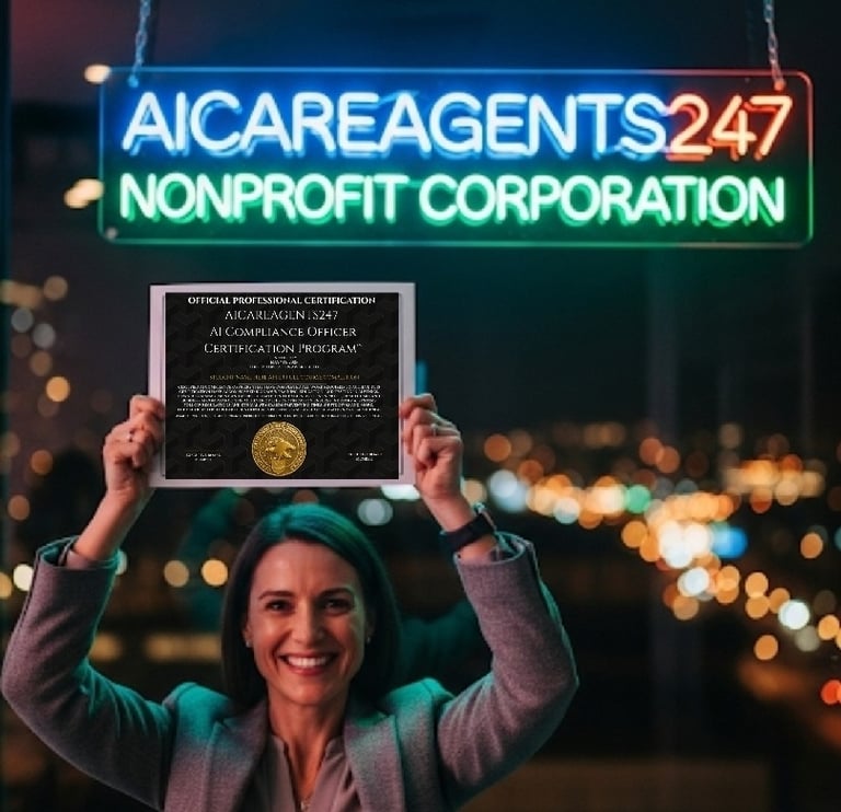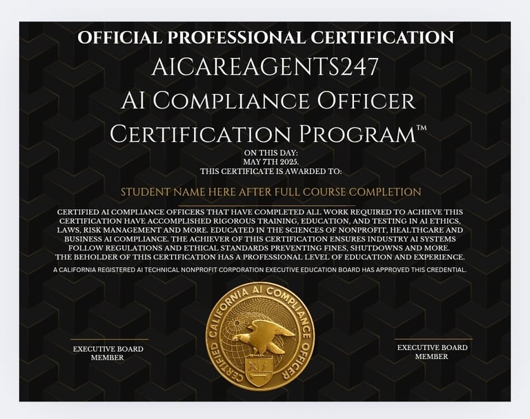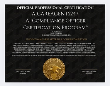 Certification Lessons #14 , #15 , #16 , #17 of the AICAREAGENTS247 AI Compliance Officer Certification Program™, deeply focuses on comprehensive AI governance and compliance within California. The content addresses the implementation of artificial intelligence for nonprofits and businesses, covering topics such as fundraising, financial services, marketing, and operational automation. A significant emphasis is placed on adhering to California regulations like the Attorney General’s Charitable Trusts regulations, CPRA, DFPI, and DCA, ensuring ethical AI use, data privacy, bias mitigation, and robust incident response protocols. The program prepares individuals for government AI audits, detailing necessary documentation, audit triggers, presentation strategies, and the handling of regulatory inquiries to ensure full legal adherence.